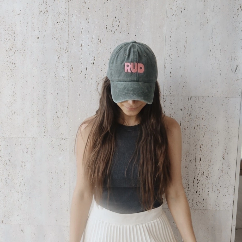 Gorra en color verde petroleo lavado con logo RUD en color rosa, tira trasera regulable