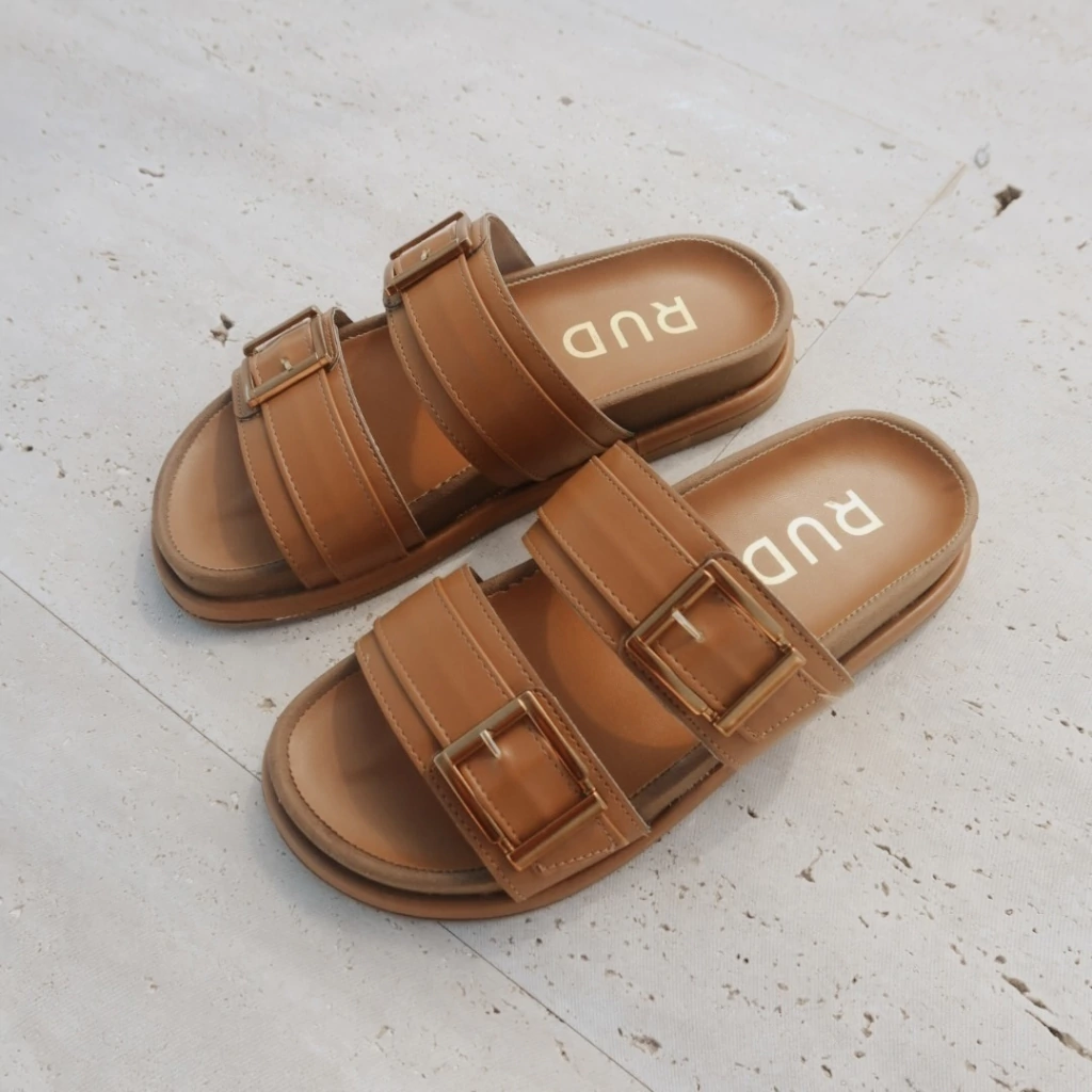 Sandalias de eco cuero color canela. La tanda presenta un error en las hebillas, ver la falla en las fotos.